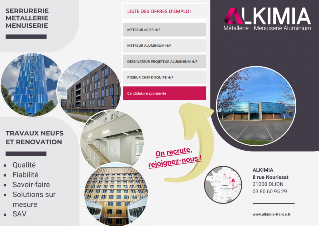Implantée à Dijon et dirigée par Thierry Potron et Christian Charollois (respectivement anciens gérants de Serrurerie Bernard et Acrem Métal), ALKIMIA rayonne de la région parisienne à la région Rhône-Alpes. Forte de la pluralité de ses ateliers, comptant une centaine de collaborateurs, intégrant deux bureaux d'étude (acier et aluminium), disposant d'un site de production de 4000m² (dont 500m² de bureau), cette nouvelle société devient donc un acteur prépondérant dans son domaine d'activité. Tout en conservant une dimension humaine lui conférant souplesse et réactivité, ALKIMIA est armée pour affronter solidement et sereinement l'avenir et poursuivre ainsi son développement.